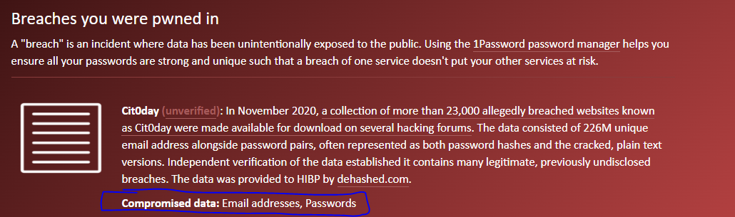 털렸다면 이렇게 나오는데, 털린 정보까지(아래 파란색 박스 "Compromised data : Email addresses, Passswords") 나오니까 얼릉 가셔서 변경하세요!