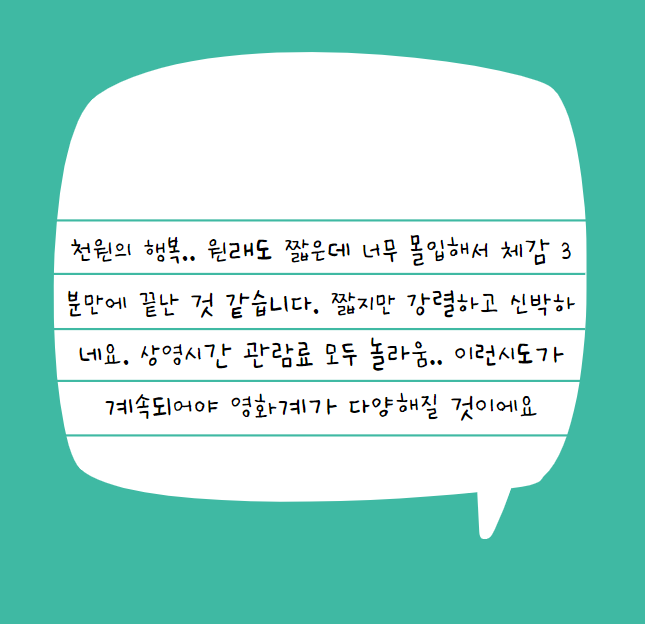밤낚시는 네이버 평점 7.96/10로 높은 편입니다. CGV에서 밤낚시를 6월에 단돈 1000원에 개봉을 했기도 하고, 러닝타임이 13분밖에 되지 않다보니 신선하다는 평이 많이 있습니다. 밤낚시는 짧은 러닝타임에도 불구하고 몰입감이 장난이 아니고, 연출도 마음에 들고 장편이나 드라마로 만들어달라는 평이 많습니다.