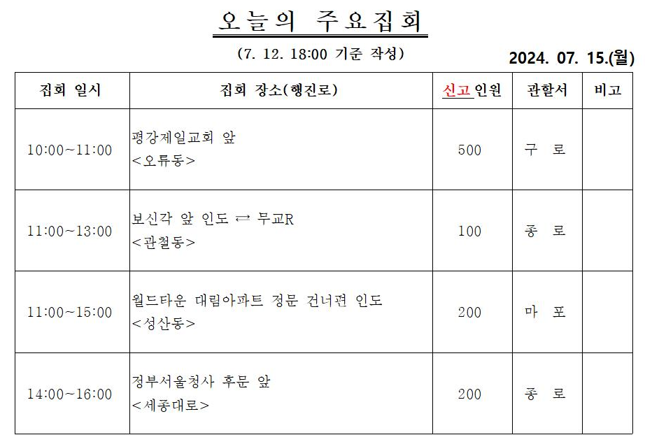 링크에 가시면 이런식으로 매일의 주요 집회 내용을 확인하실 수 있습니다.
